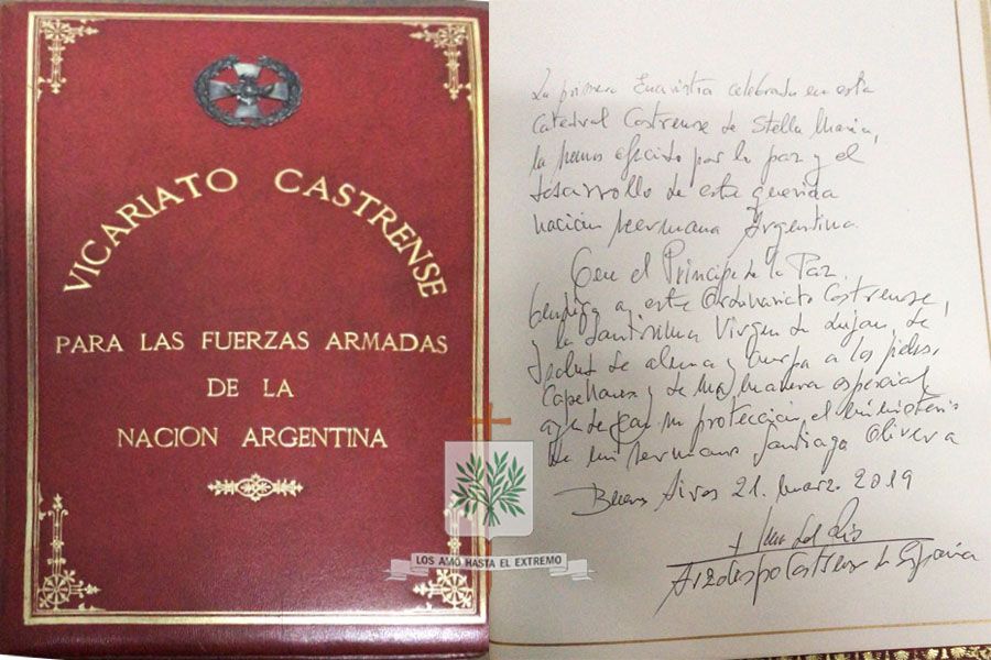 Por su parte, el Arzobispo Castrense de España, plasmaba en nuestro Libro Dorado, que ésta primera Eucaristía celebrada en la Catedral, fue ofrecida por la paz y el desarrollo de nuestra República Argentina. Pidiendo, que el Principie de la Paz Bendiga a este Ordinariato Castrense”.