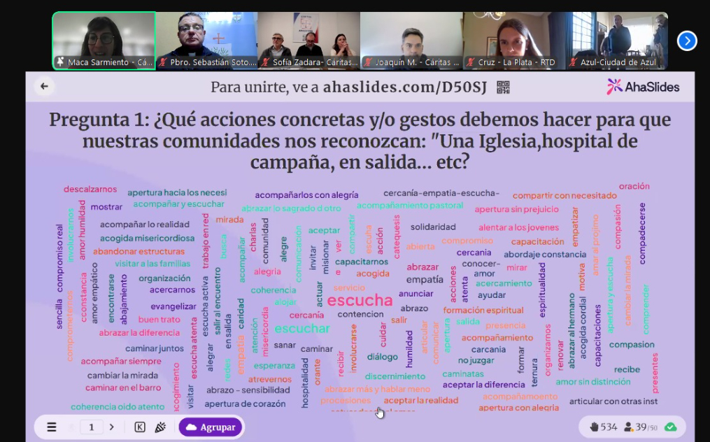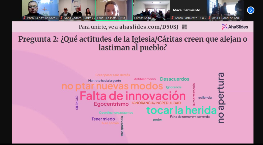 Los participantes del encuentro nacional ahondaron sobre las problemáticas de nuestra sociedad argentina tales como, la salud mental, falta de trabajo, la precarización laboral, falta de sentido a la vida y una alarma relevante, las adicciones y los suicidios. A la luz de las palabras del Santo Padre Francisco cuando habló de la Virgen Santísima describiéndola cómo “María apurada” en su acción de estar presente junto a sus hijos, se planteaba, poder desplegar la misión al estilo de hacer una Caritas de puertas abiertas y pies ligeros, estando con el que nos necesitan.