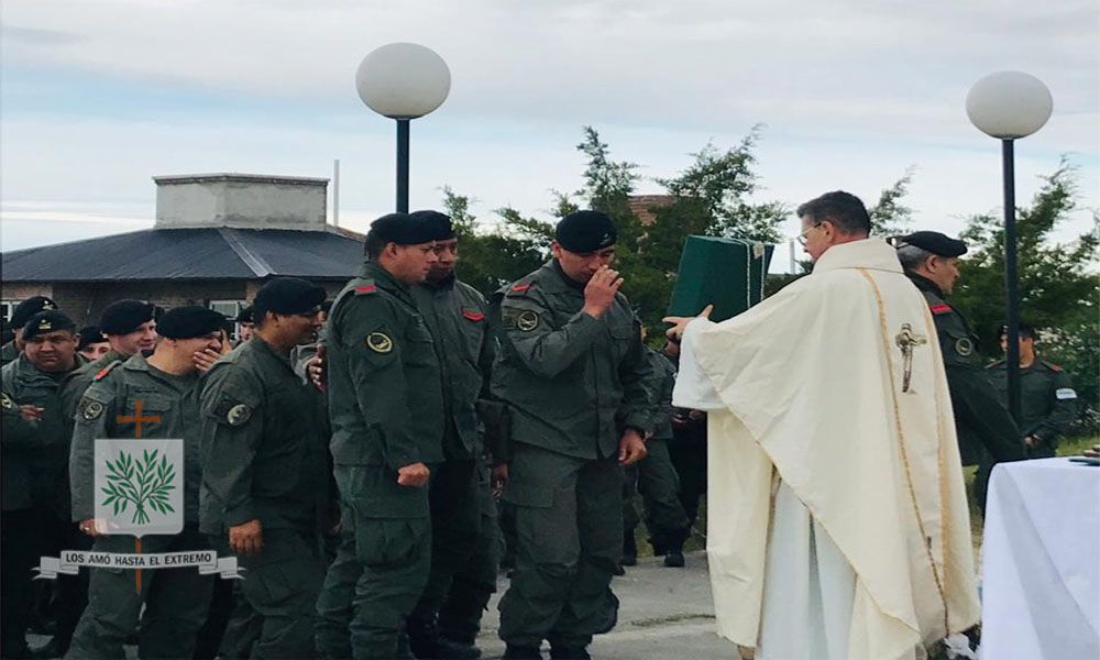 Muy temprano, la totalidad del personal Móvil 4 de GNA junto a su Capellán, Padre Víctor Hugo Massarotti, peregrinaron junto a su Santísima Virgen Patrona, Ntra. Sra. de Luján hasta la base de la Cruz del Valle Argentino. Un día destemplado como ninguno en esta primavera que teñía de ocre el cielo en nuestra provincia de La Pampa, el viento soplaba intenso como símbolo de presencia en torno al altar de Campaña.