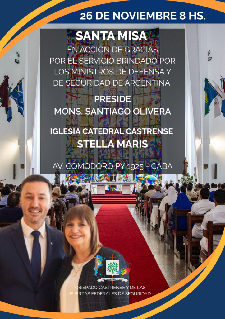 Es de destacar que el próximo miércoles 26 de noviembre en nuestra Iglesia Catedral Castrense, Stella Maris, Comodoro Py 1925, Ciudad Autónoma de Buenos Aires, el Obispo Castrense y de las Fuerzas Federales de Seguridad presidirá a las 8 horas, la Santa Misa en Acción de Gracias por los Sres. Ministros de Defensa y Seguridad. Será un tiempo para poder rezar y agradecer por la labor y servicio prestados por el Dr. Luis Petri y la Dra. Patricia Bullrich quienes dejarán su cargo por haber sido electos Senadores de la República Argentina.-