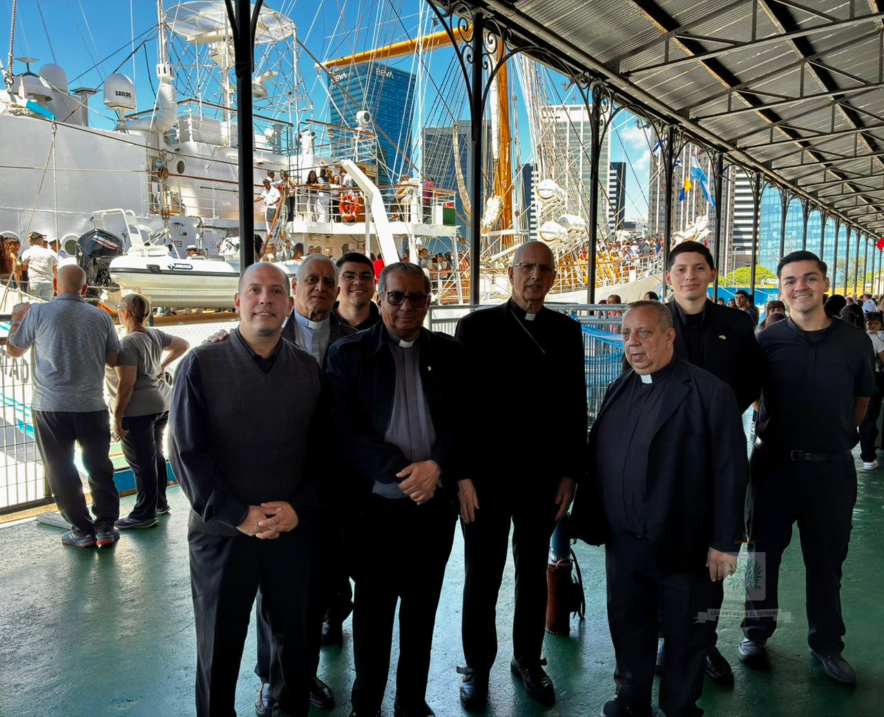 MONS. OLIVERA | Rezamos por el nuevo servicio que cumplirán a la Patria, los nuevos Ministros de Defensa y Seguridad ejerciendo esta labor tan difícil sin perder su mirada humana, de custodia y defensa, así lo señalaba el Obispo Castrense desde la Darsena Norte, donde esperaba el arribo de la Fragata ARA Libertad. El Obispo quien se hacía presente junto al Capellán Mayor de la Armada Argentina, Padre Francisco Rostom Maderna, el Capellán Mayor de GNA, Padre Jorge Massut, el Rector del Seminario Diocesano, Padre Daniel Díaz Ramos, el Diácono Lucas Garcilazo y Seminaristas Castrenses, esperando al Capellán de la Fragata, Padre Luis Villafañe y a la tripulación de Guardiamarina se refirió a la flamante noticia de los nombramientos en las carteras de Defensa y Seguridad.