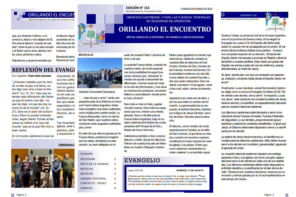 Orillando el Encuentro N° 152, ya se encuentra disponible el boletín informativo de la Diócesis Castrense de Argentina, el mismo se encuentra en formato PDF para leer, descargar e imprimir en una edición especial, día de la Independencia. En esta entrega, encontraremos en portada el mensaje de nuestro Obispo se refiere también al día de San Lorenzo, Patrono de los Diáconos, al respecto, decía, agradezco la presencia de cada uno de los Diáconos, y por los que están en camino de formación; agradezco la generosidad de su respuesta, al sentirse llamados, atraídos por la figura de Jesús Servidor, servidor de todos. Servidor para la salvación”.