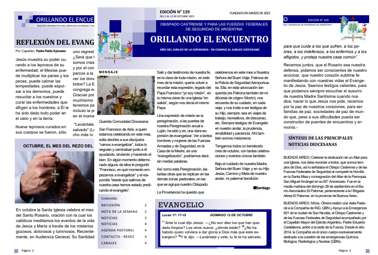 Orillando el Encuentro N° 159, ya se encuentra disponible el boletín informativo de la Diócesis Castrense de Argentina, el mismo se encuentra en formato PDF para leer, descargar e imprimir en una edición especial, día de la Independencia. En esta entrega, encontraremos en portada el mensaje de nuestro Obispo, Mons. Santiago quien pide, “salir y dar testimonio de nuestra fe, es la clave de toda misión, en este mes de la misión, quería volver a recordar esta expresión, legado del Papa Francisco “yo soy misión”, en la misma clave de una Iglesia “en salida”, según nos decía el mismo Papa”.