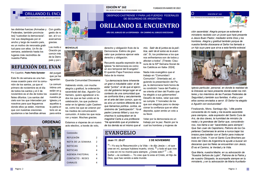 Orillando el Encuentro N° 162, ya se encuentra disponible el boletín informativo de la Diócesis Castrense de Argentina, el mismo se encuentra en formato PDF para leer, descargar e imprimir en una edición especial, día de la Independencia. En esta entrega, encontraremos en portada el mensaje de nuestro Obispo, Mons. Santiago nos dice, “velar por la democracia es un trabajo por la paz. Razón por la cual los hombres y mujeres de las distintas fuerzas (Armadas y Federales, también provinciales] “custodian la democracia”.
