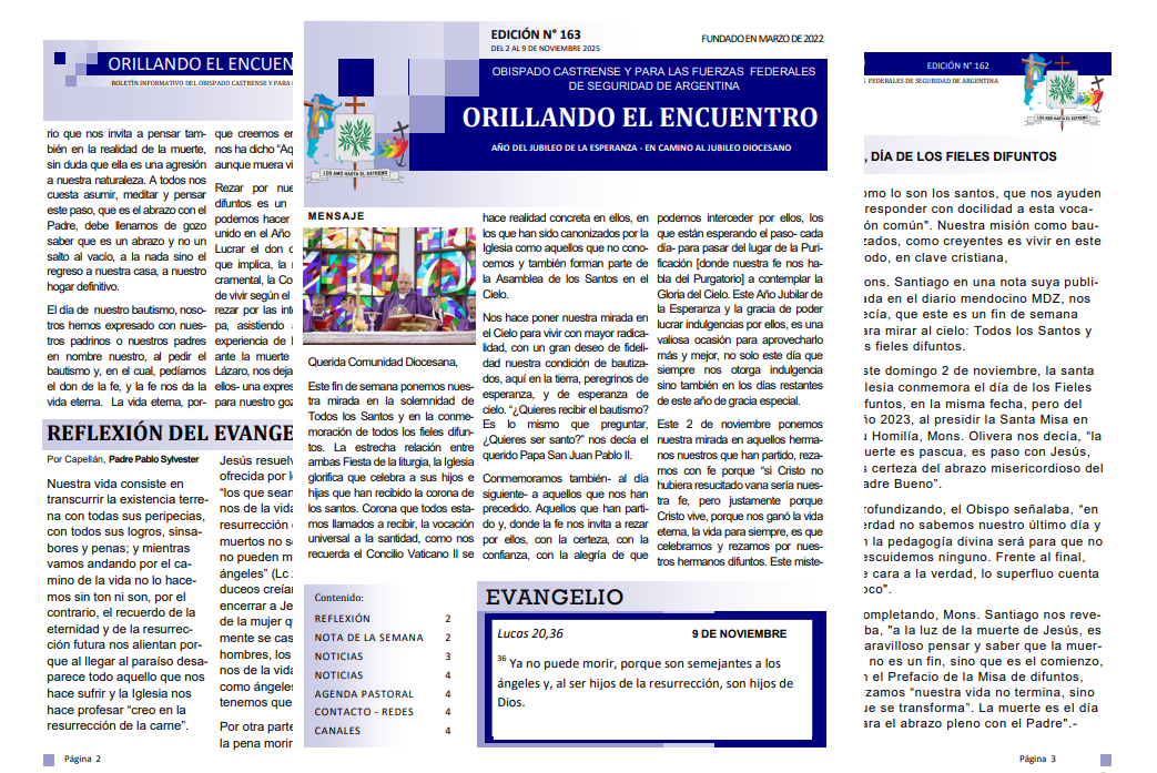 Orillando el Encuentro N° 163, ya se encuentra disponible el boletín informativo de la Diócesis Castrense de Argentina, el mismo se encuentra en formato PDF para leer, descargar e imprimir en una edición especial, día de la Independencia. En esta entrega, encontraremos en portada el mensaje de nuestro Obispo, Mons. Santiago refiriéndose a la solemnidad de Todos los Santos y el día de los Fieles Difuntos nos invita a, “(…) poner nuestra mirada en el Cielo para vivir con mayor radicalidad, con un gran deseo de fidelidad nuestra condición de bautizados, aquí en la tierra, peregrinos de esperanza, y de esperanza de cielo.”.