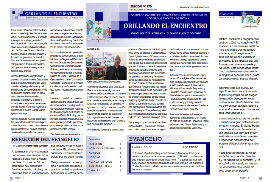 Orillando el Encuentro N° 170, ya se encuentra disponible el boletín informativo de la Diócesis Castrense de Argentina, el mismo se encuentra en formato PDF para leer, descargar e imprimir en una edición especial, día de la Independencia. En esta entrega, encontraremos en portada el mensaje de nuestro Obispo, Mons. Santiago quien al concluir el año 2025, hace un repaso de todo lo vivido y nos dice, “los invito a que frente al Pesebre que nos habla del amor de Dios, de la humildad y de la ternura, podamos repasar a modo de oración agradecida tantas cosas vividas y agradecer lo que nos dio el Señor, y como dijo Aylín, lo que no nos dio también, sabias palabras del espíritu, porque Él sabe bien aquello que necesitamos, porque Él sabe que todo es Bien para aquellos que ama”.