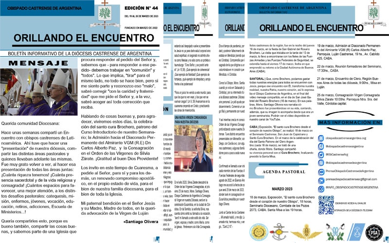 Orillando el Encuentro N° 44, ya se encuentra disponible el boletín informativo de la Diócesis Castrense de Argentina, disponible en formato PDF para leer, descargar e imprimir. En esta nueva edición, encontraremos el mensaje de nuestro Obispo, Mons. Santiago Olivera, nos pide, “los invito en este tiempo de Cuaresma, a pedirle al Señor, para sí y para los demás, un renovado compromiso apostólico, en el propio estado de vida, para el bien de nuestra familia diocesana, para el bien de toda la Iglesia”.