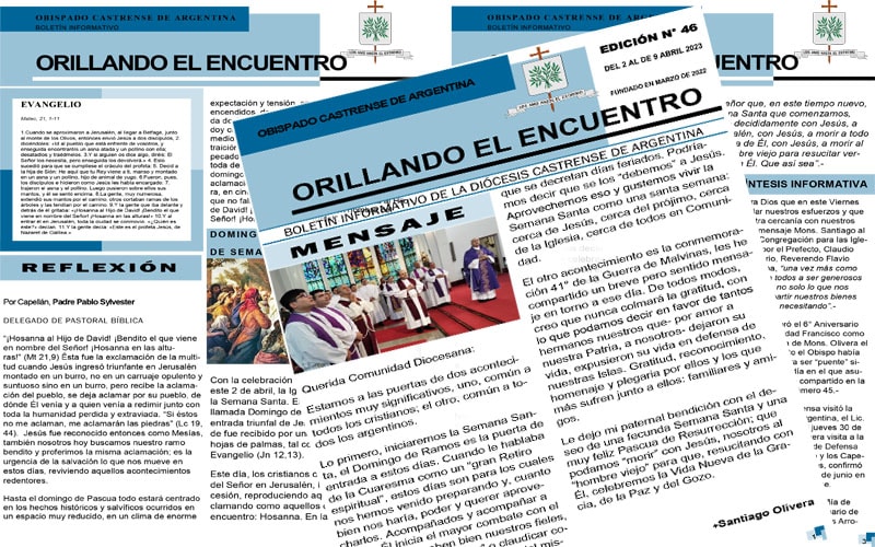 Orillando el Encuentro N° 46, ya se encuentra disponible el boletín informativo de la Diócesis Castrense de Argentina, disponible en formato PDF para leer, descargar e imprimir. En esta nueva edición, encontraremos el mensaje de nuestro Obispo, Mons. Santiago Olivera, donde comparte, “iniciaremos la Semana Santa, el Domingo de Ramos es la puerta de entrada a estos días. Cuando le hablaba de la Cuaresma como un “gran Retiro espiritual”, estos días son para los cuales nos hemos venido preparando y, cuanto bien nos haría, poder y querer aprovecharlos. Acompañados y acompañar a Jesús”.