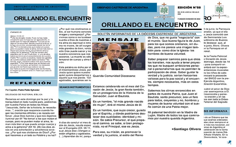Orillando el Encuentro N° 58, ya se encuentra disponible el boletín informativo de la Diócesis Castrense de Argentina, disponible en formato PDF para leer, descargar e imprimir. En esta nueva edición, encontraremos el mensaje de nuestro Obispo, Mons. Santiago Olivera quien nos comparte en el mes del Sagrado Corazón de Jesús se refirió también a Juan el Bautista, de él nos decía, “saber preparar caminos para que otros los transiten, nos ayuda a tener proyectos que no busquen ambiciones personal o personalismos que no permiten la participación de otros. Saber gustar la verdad y la justicia, serían horizontes valiosos para la paz social y el encuentro, siempre necesarios, más en estos tiempos”.