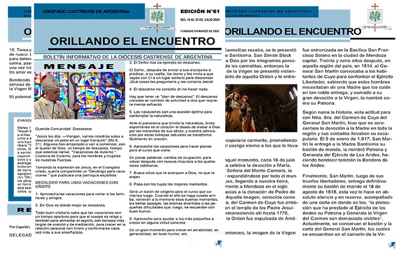 Orillando el Encuentro N° 61, ya se encuentra disponible el boletín informativo de la Diócesis Castrense de Argentina, disponible en formato PDF para leer, descargar e imprimir. En esta nueva edición, encontraremos el mensaje de nuestro Obispo, Mons. Santiago Olivera a la luz del Evangelio, “Vengan, vamos nosotros solos a descansar un poco en un lugar tranquilo» (Mc 6, 31), nos comparte un «Decálogo para vacaciones » que publicara una parroquia española.