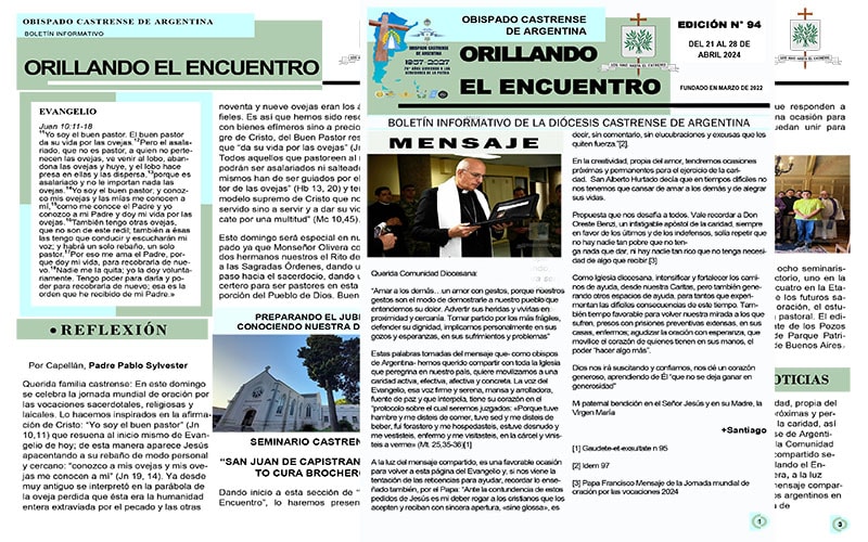 Además, hallarán la reflexión sobre el EvangelioJuan 10:11-18En el interior del boletín, podrán leer la nota Preparando el Jubileo Diocesano – Conociendo nuestra Diócesis – SEMINARIO CASTRENSE “SAN JUAN DE CAPISTRANO Y SANTO CURA BROCHERO”, también encontrarán como siempre la síntesis informativa y la agenda pastoral.
