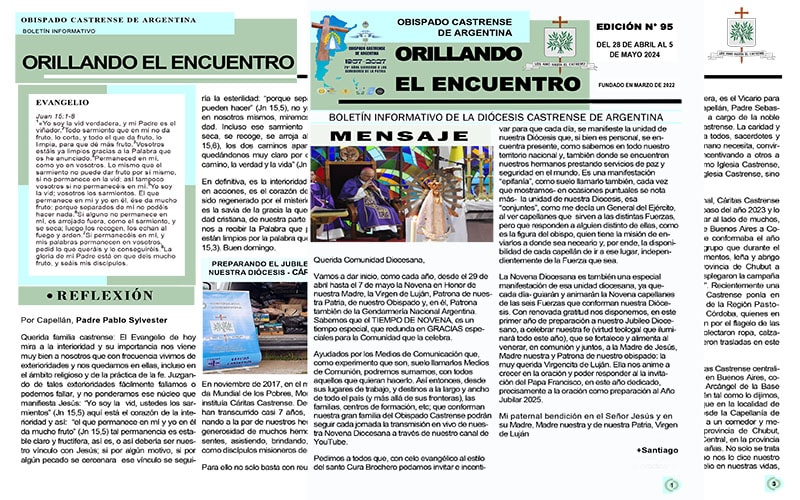 Orillando el Encuentro N° 95, ya se encuentra disponible el boletín informativo de la Diócesis Castrense de Argentina, disponible en formato PDF para leer, descargar e imprimir. En esta nueva edición, encontraremos el mensaje de nuestro Obispo, Mons. Santiago Olivera  nos dice, la Novena Diocesana es también una especial manifestación de esa unidad diocesana, con renovada gratitud nos disponemos, en este primer año de preparación a nuestro Jubileo Diocesano, a celebrar nuestra fe (virtud teologal que iluminará todo este año), que se fortalece y alimenta al venerar, en comunión y juntos, a la Madre de Jesús, Madre nuestra y Patrona de nuestro obispado: la muy querida Virgencita de Luján”.