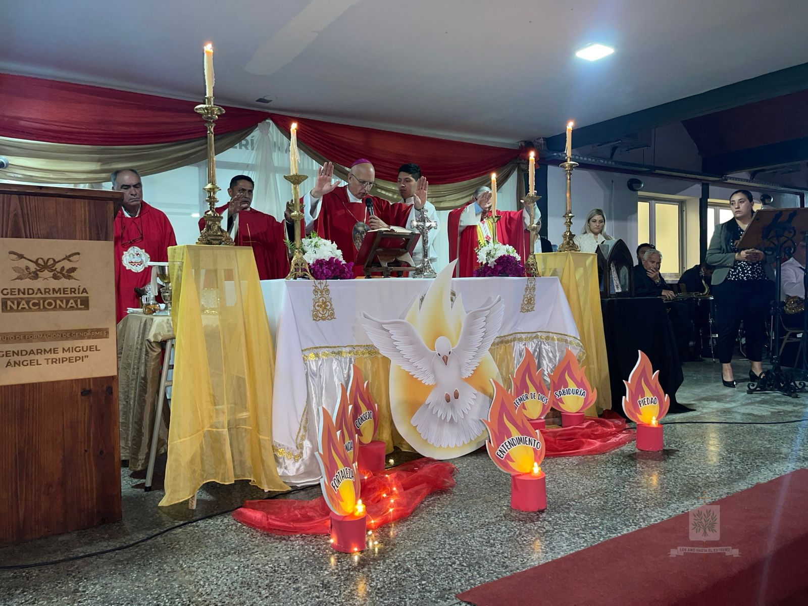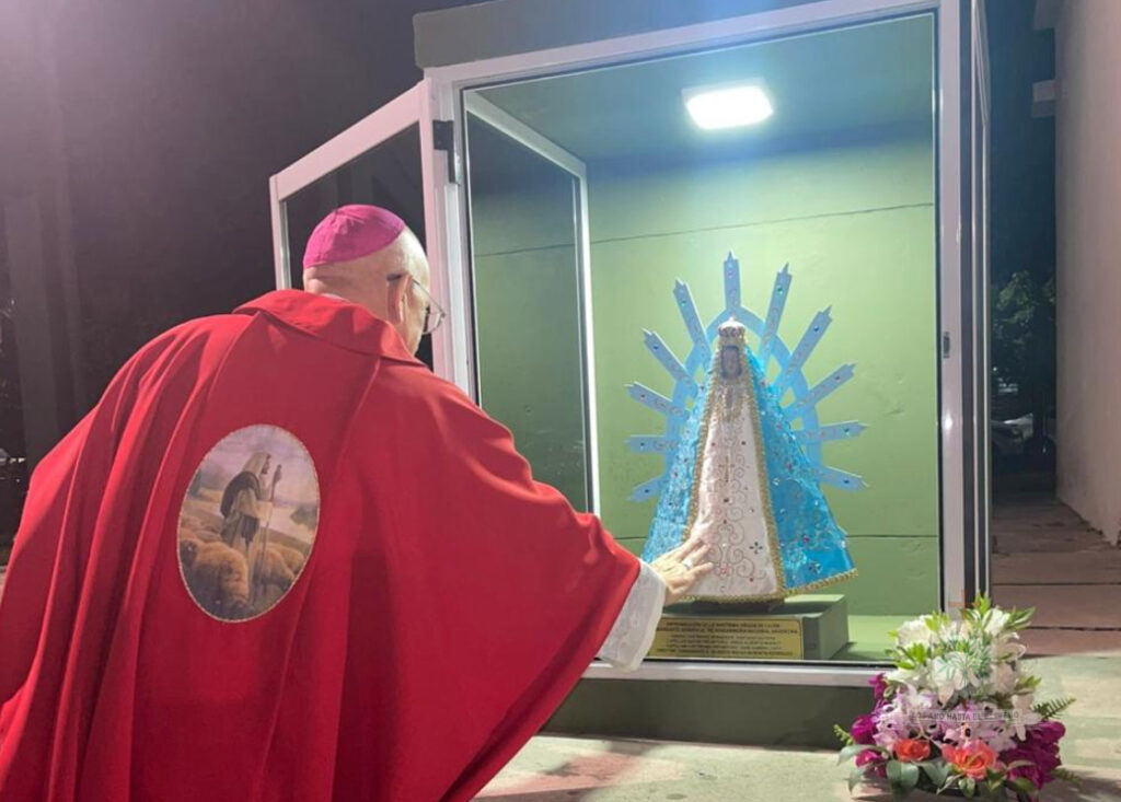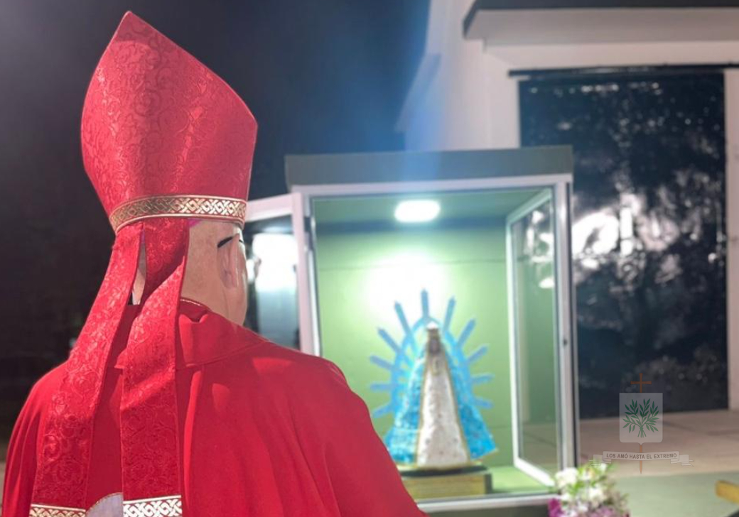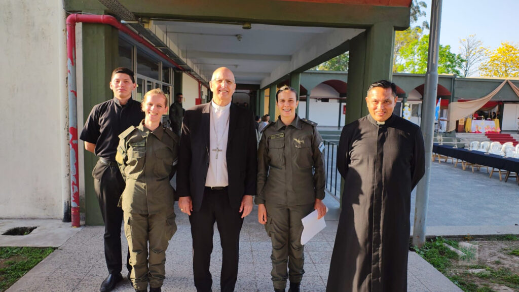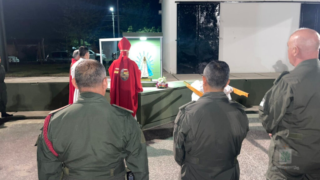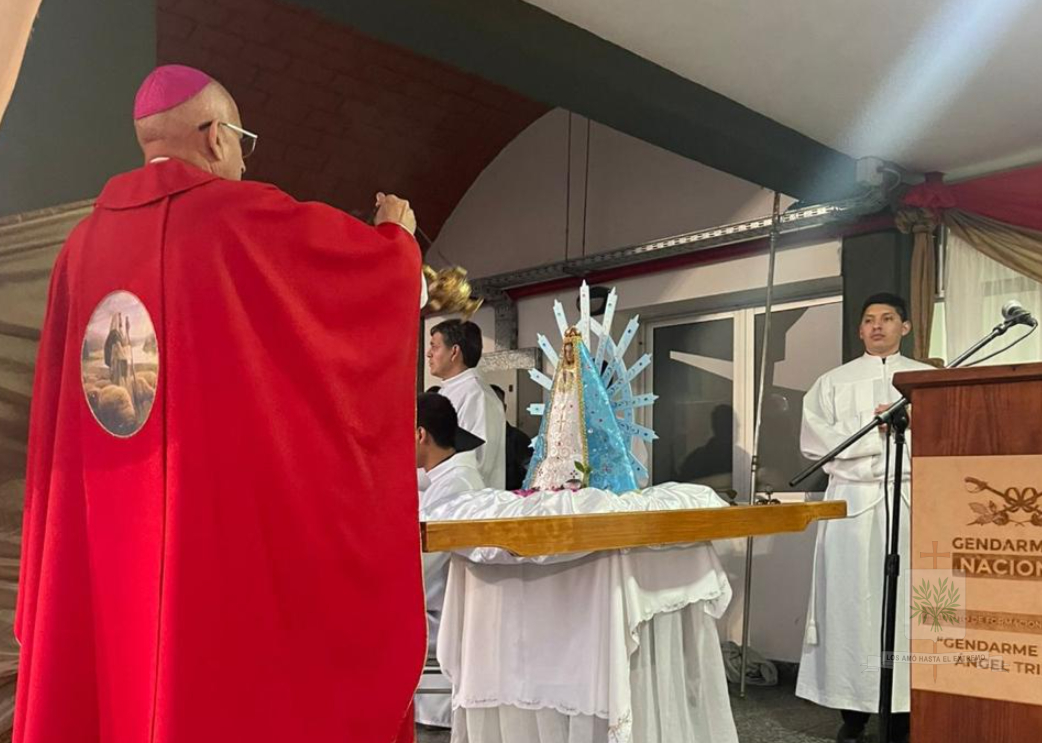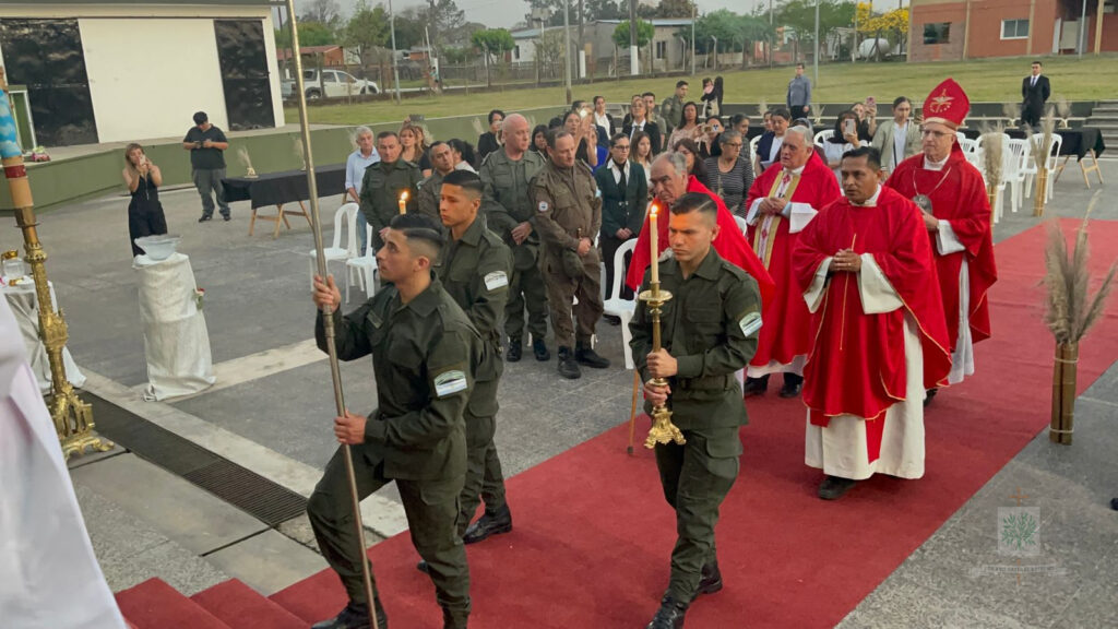 TUCUMÁN | En su visita pastoral al INSTRIPEPI, Mons. Olivera entronizó la imagen de la Comandante Generala de GNA, Ntra. Sra. de Luján y administró Sacramento de Confirmación, tras su arribo a la provincia el pasado 23 de septiembre, el Obispo Castrense y de las Fuerzas Federales de Seguridad se trasladaba hasta la localidad de Capitán Cáceres, Departamento Monteros, sede del Instituto de Formación de Gendarmes, Gendarme Miguel Ángel Tripepi (INSTRIPEPI). El Obispo, acompañado por el Capellán Mayor de GNA, Padre Jorge Massut cerca de las 16 horas de ese día, era recibido por el Director del Instituto, el Comandante, Gilberto Matías Mendieta Rodríguez, el Capellán, Padre Juan Gabriel Cayo, quienes estaban acompañados por el equipo de formación, con quienes tuvo una breve y cordial charla mientras compartieron una merienda.
