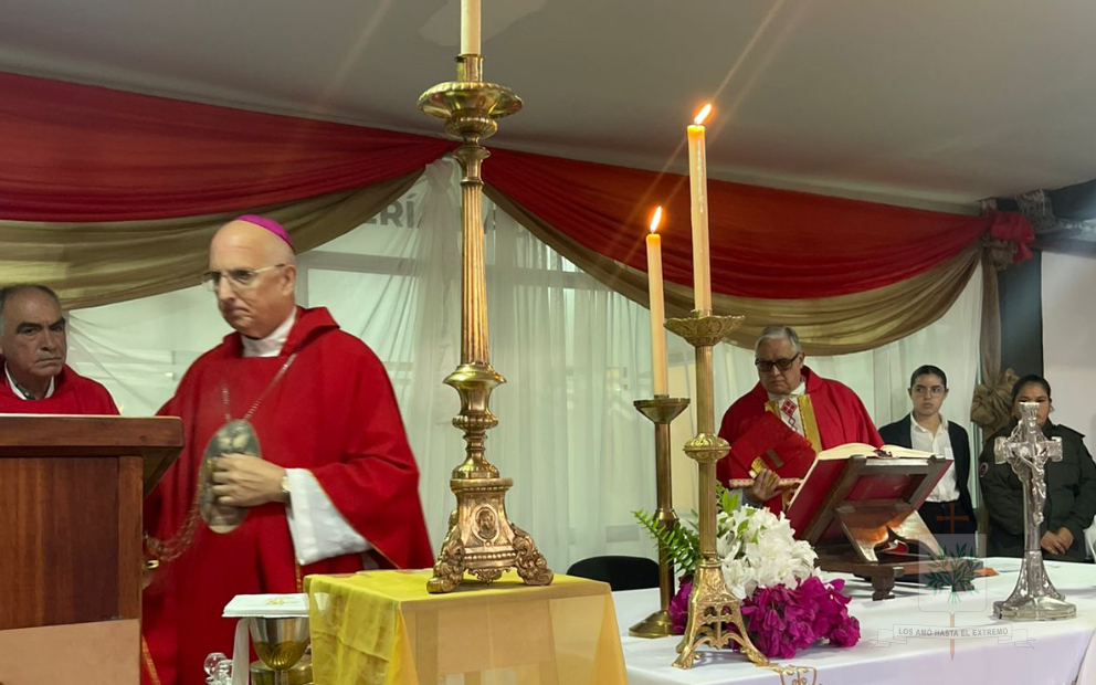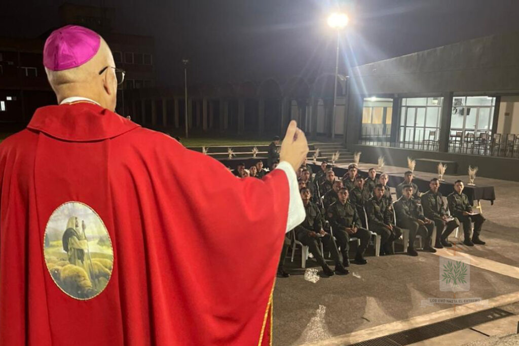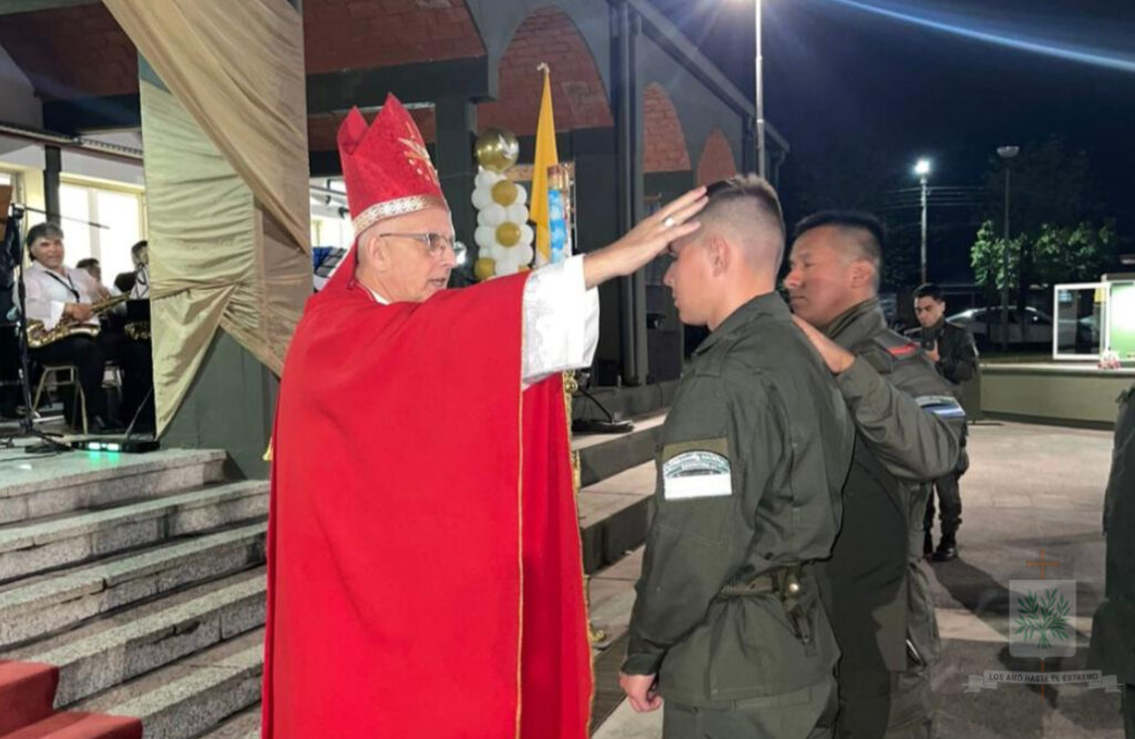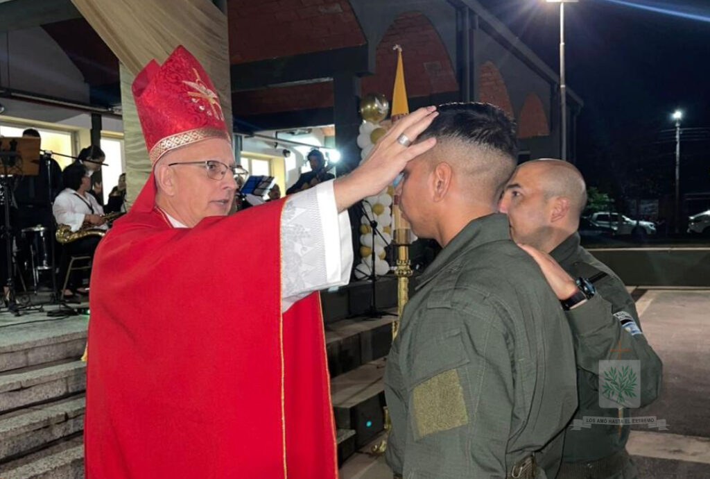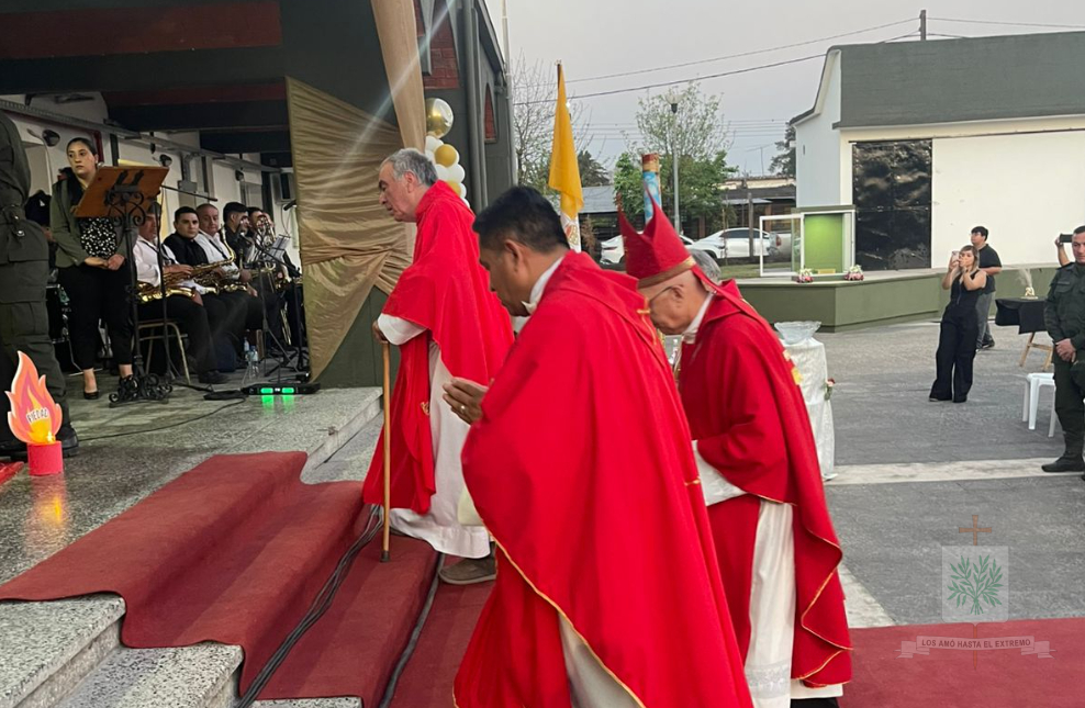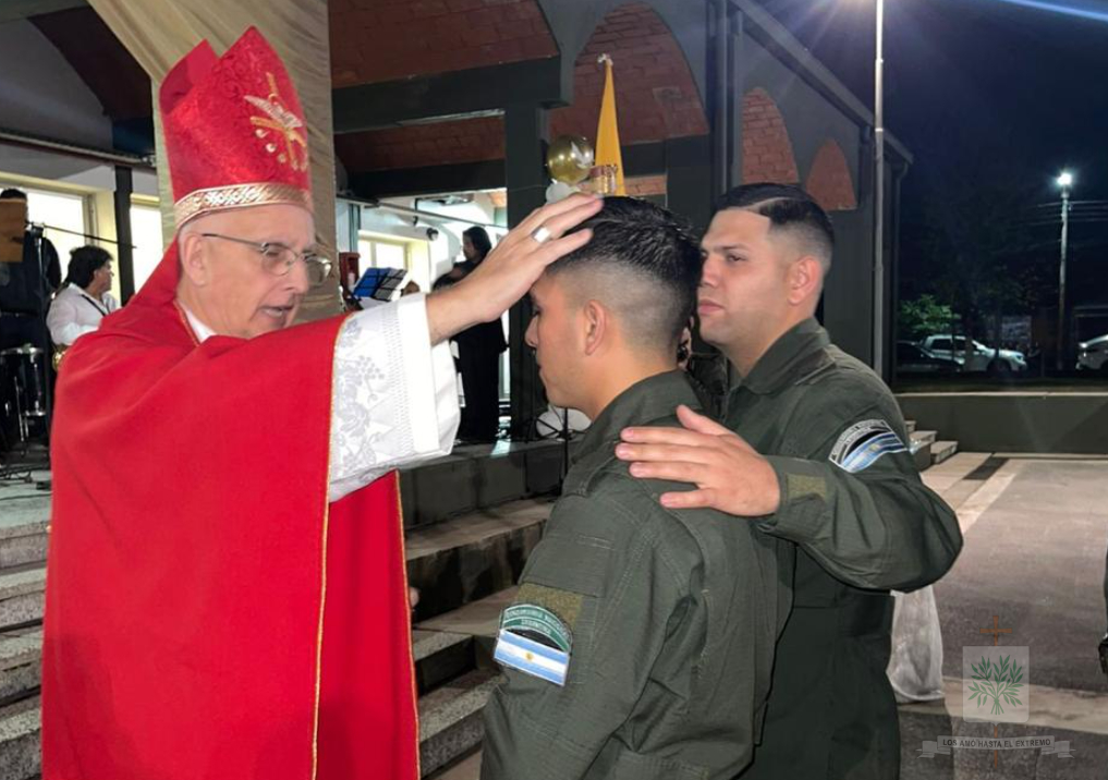 Seguidamente, el Obispo presidió la Santa Misa, celebrada en la Plaza de Armas del INSTRIPEPI, participaron, el Jefe de la Región IV, Comandante General Luis María Cané, junto a los Jefes del Escuadrón 55 «Tucumán», Comandante Principal Diego Rodrigo Gauna, y del Escuadrón Núcleo «Aguilares», Comandante Principal Ancelmo Félix García. Ese día, Mons. Santiago confería Sacramento de iniciación Cristiana a 22 Aspirantes, marcando un hito en su camino espiritual y profesional.